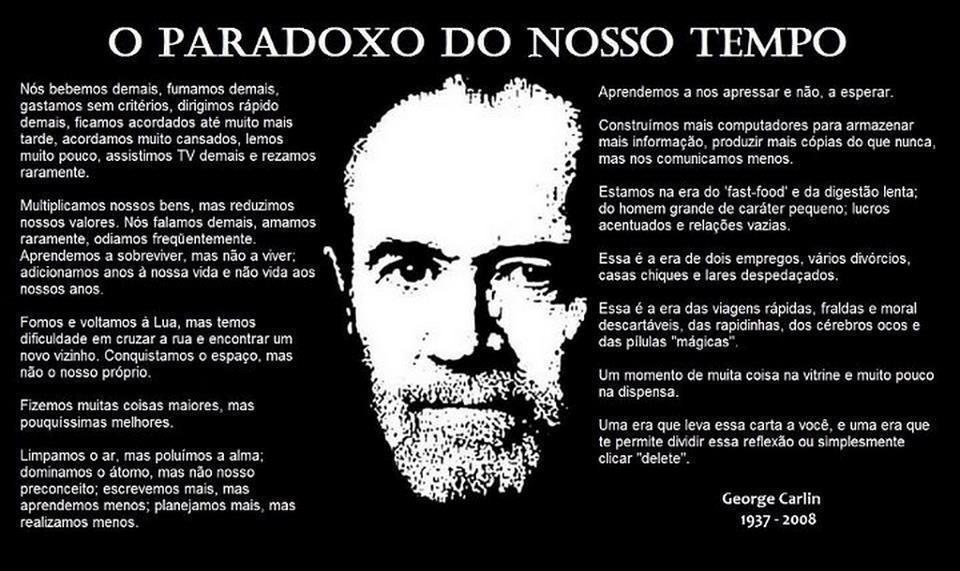 Talvez em nenhuma outra época tenhamos acumulado tantos recursos científicos, técnicos e de conhecimentos. No entanto admitimos um caos social organizado e consciente orquestrado por parte daqueles que não tem qualquer compromisso senão com sua própria vaidade e egoísmo. Aceitamos pacificamente que pessoas e organizações acumulem riquezas materiais publicáveis apenas em cifras de milhões, de bilhões, assim como o fazemos em relação aos milhões que vivem abaixo da linha da miséria e que não tem acesso à medicina, à educação, à habitação e condições mínimas de cidadania.